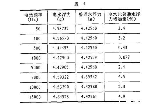 實(shí)驗(yàn)用的振蕩穩(wěn)壓源是上海華東電子儀器廠制造的,輸出功率75W,該電源的電壓在實(shí)驗(yàn)時(shí)保持300V、600V和700V三個(gè)數(shù)值。改變頻率從0到15kHz,水流過電場的速度為0.16m/s,水溫12.0±0.3℃,用長春市自來水和地下深井水。電水形成后20分鐘開始測浮力。測試時(shí)間為1984年10月18日到1984年10月21日,重復(fù)性實(shí)驗(yàn)進(jìn)行六次,曲線都帶有極值。表4是在電壓600V下的一組數(shù)據(jù)。