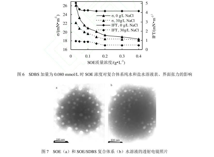 測試發(fā)現(xiàn)十二烷基苯磺酸鈉(SDBS)在純水溶液中的ccmc為0.5 mmol/L(0.174 g/L),該濃度下溶液的表、界面張力分別為27.06 mN/m和0.18 mN/m;SDBS在30 g/L NaCl溶液中的ccmc為0.080 mmol/L(0.028 g/L),該濃度下溶液的表、界面張力分別為27.62 mN/m和0.21 mN/m。因此,選擇與SOE復合的SDBS的濃度為0.08 mmol/L。