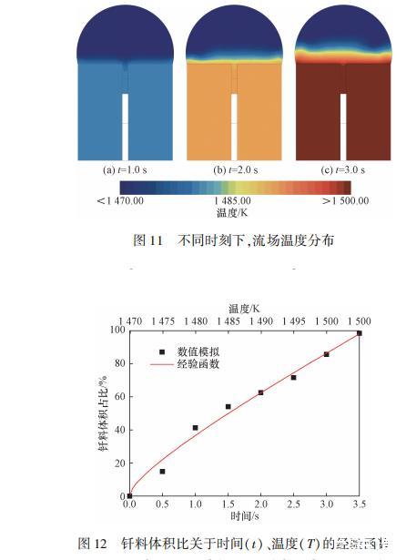 圖11給出了不同時(shí)刻下的流場溫度分布。不同時(shí)刻下的釬料頂端的溫度場幾乎沒有變化,這是因?yàn)橥獠坑?jì)算區(qū)域內(nèi)充滿空氣,釬料與空氣之間的熱效率遠(yuǎn)低于釬料和母材之間,故空氣對(duì)釬料的溫度控制影響是微乎其微的。釬料底部溫度隨著母材升溫迅速上升,由于相變潛熱的存在,使得上方釬料溫度分布始終保持在熔點(diǎn)以下(1470.0K)。