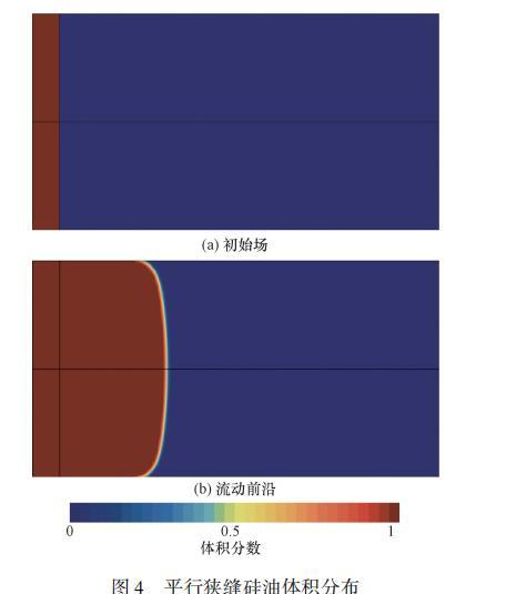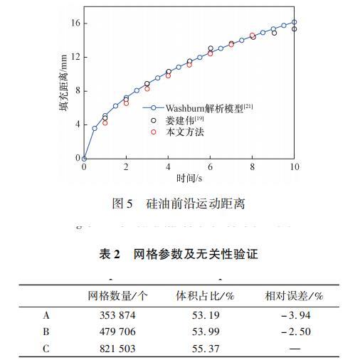 根據(jù)式(6)與式(7)可以看出,這類由表面張力驅(qū)動(dòng)的流動(dòng)與邊界處接觸角緊密相關(guān)。為保證接觸角施加方法的正確性,對(duì)表面張力驅(qū)動(dòng)下的平行平板流動(dòng)進(jìn)行了計(jì)算,并將結(jié)果與前人的數(shù)值模擬結(jié)果進(jìn)行了對(duì)比。驗(yàn)證模型為15mm×8mm×0.4mm的平行平板,所采用材料為硅油,具體物性參數(shù)如表1所示。首先將平板前端部分區(qū)域內(nèi)充滿硅油,以此為初始場進(jìn)行計(jì)算[圖4(a)]。圖4(b)為計(jì)算一段時(shí)間后得到的流動(dòng)前沿,最終得到的前沿最大高度隨時(shí)間變化如圖5所示,計(jì)算結(jié)果與前人數(shù)值模擬結(jié)果及Washburn解析模型吻合良好,證明了基于VOF模型的數(shù)值方法計(jì)算硅油填充平板過程的準(zhǔn)確性。