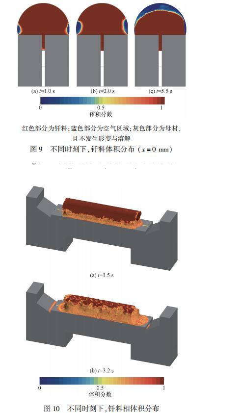 為充分評(píng)估釬料填充焊縫的流動(dòng),給出了不同時(shí)刻下x=0mm截面處的釬料體積分布(圖9),截面兩側(cè)釬料融化過程基本呈對(duì)稱分布。涂覆釬料從底部開始融化,并不斷填充焊縫,兩側(cè)慢慢形成了“凹”形液面。隨著保溫過程進(jìn)行,釬料均融化為液態(tài),液態(tài)釬料在表面張力的作用下收縮為半球形狀。