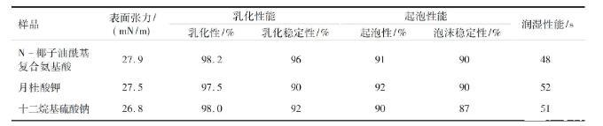 以大豆為原料合成的N-椰子油?;鶑?fù)合氨基酸表面活性劑表面張力、乳化起泡潤濕性能測定(二)