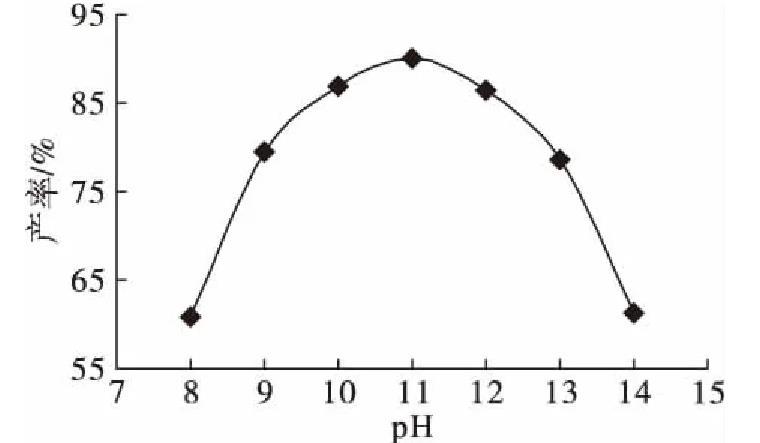 由圖2可以看出,pH影響產(chǎn)率的總體趨勢是首先逐步提高,達(dá)到最大值后逐步下降,pH為11時產(chǎn)物產(chǎn)率最大。因此,選擇pH 10~12進(jìn)行優(yōu)化試驗。