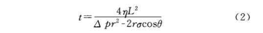 從式(1)可以看出,助排劑的表/界面張力越低,巖石越接近中性潤濕,則毛細管力越小,越有利于返排。另外,根據(jù)Poiseulle方程,當(dāng)排驅(qū)壓差為△p(MPa)時,從半徑為r(m),長為L(m)的毛細管中排出黏度為η(mPa·s),表面張力為σ(mN/m)和接觸角為θ(°)的液體所需時間t(s)的表達式為:
