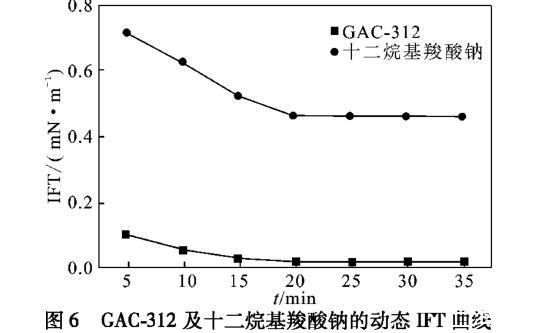 由圖6可知,羧酸鹽Gemini表面活性劑GAC-312在20 min內(nèi)可將油水界面張力降至7.6×10-3mN/m(超低界面張力級別),相同條件下,十二烷基羧酸鈉將界面張力僅降低至4.54×10-1mN/m,GAC-312界面活性優(yōu)異。GAC-312能夠具備優(yōu)秀的界面活性主要是由于羧基和水之間具有較強親和力,導(dǎo)致GAC-312可以更快、更好地吸附在界面上,其分子在油/水界面上的排列更緊密,降低油水界面張力的能力更強。
