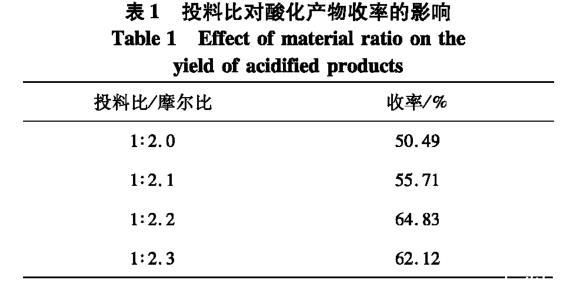 2.2.1N,N-丙二胺二乙酸鈉的合成條件優(yōu)化N,N-丙二胺二乙酸鈉的合成反應(yīng)中,不同反應(yīng)條件會生成不同的丙二胺取代產(chǎn)物;為了得到目標產(chǎn)物N,N-丙二胺二乙酸鈉,同時減少其它副取代產(chǎn)物,采用單因素分析法研究了丙二胺和氯乙酸鈉的投料比對目標產(chǎn)物丙二胺二乙酸鈉收率的影響。由于丙二胺二乙酸鈉溶解在混合溶劑中無法提取,因此采用酸化處理的辦法得到其酸化物N,N-丙二胺二乙酸,通過對比中間體酸化物的收率來確定合成目標中間體所需的最佳投料比(摩爾比),結(jié)果見表1。