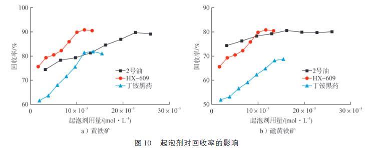 由圖10可知:在起泡劑用量相同條件下,HX-609在提升黃鐵礦回收率方面的效果顯著優(yōu)于另外兩種起泡劑。對于磁黃鐵礦而言,2號油與HX-609的浮選效果相當。然而,從藥劑成本角度考量,2號油更具有優(yōu)勢。