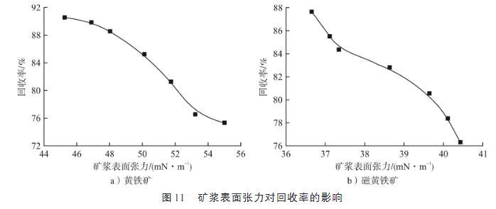 4)通過考察礦漿表面張力對浮選回收率的影響可知,礦漿表面張力與浮選回收率成反比關系,隨著礦漿表面張力的降低,黃鐵礦與磁黃鐵礦的回收率均顯著增加。這一規(guī)律可以用于指導生產(chǎn)實踐,即在硫化礦浮選中,可以嘗試通過降低礦漿表面張力來改善硫化礦的回收效果。
