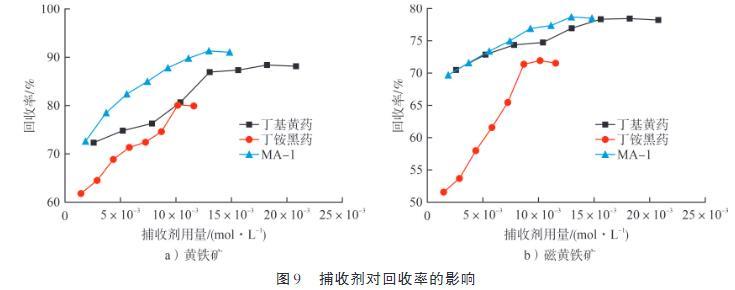 由圖9可知:黃鐵礦與磁黃鐵礦的回收率整體均隨著捕收劑用量的增加而逐漸提升;當回收率達到峰值后,繼續(xù)增加捕收劑用量,回收率趨于穩(wěn)定狀態(tài)。相較于丁銨黑藥和丁基黃藥,MA-1作為黃鐵礦的捕收劑性能更佳。在磁黃鐵礦的浮選過程中,使用丁基黃藥和MA-1作為捕收劑時,回收率差異不顯著。鑒于實際生產(chǎn)過程中簡化藥劑制度和降低藥劑成本的考量,丁基黃藥更適宜作為磁黃鐵礦捕收劑。