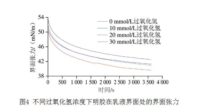 兩親性蛋白質促進蛋白質吸附到油-水界面并降低油相和水相之間的界面張力,從而形成穩(wěn)定的界面層。如圖4所示,氧化組的明膠界面張力均低于對照組,這表明所有明膠樣品均具有表面活性。明膠在油-水界面處的界面張力隨著過氧化氫濃度的增加而降低。不同過氧化氫濃度下明膠的界面張力隨時間的延長逐漸降低,從未氧化組的53.8 mN/m下降到30 mmol/L組的50.7 mN/m。界面張力隨著吸附時間的延長而降低,下降速率逐漸減小,這反映了蛋白質在界面上的吸附和覆蓋。明膠界面張力的下降與其更好的兩親性有關。因此,在本研究中氧化導致明膠水接觸角的增加,提高了明膠的疏水性并改善了明膠的兩親性,增加了蛋白質向油-水界面的吸附,這可能引起油-水界面張力的下降。Feng Xin等支持這一觀點并報道,在豬皮明膠的提取過程中提高提取溫度也會引起界面張力的降低,并認為隨著提取溫度的升高會破壞明膠原有的三螺旋結構,從而暴露出更多的疏水基團,這促使明膠分子能夠更快地吸附到油-水界面上,從而更大程度地降低界面張力。