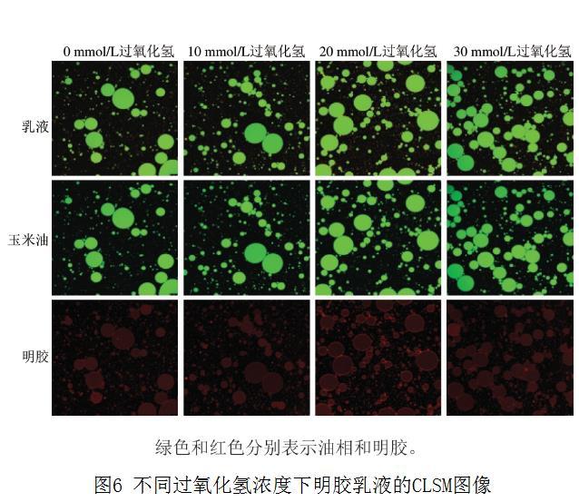 如圖5所示,明膠乳液的Zeta電位隨過氧化氫濃度的增加而降低,對照組為9.61 mV,隨著過氧化氫濃度增加至30 mmol/L,Zeta電位降低至5.94 mV,降低40%。乳液液滴Zeta電位的降低也表現出液滴間較小的靜電斥力。據報道,靜電和空間穩(wěn)定是蛋白質乳液液滴穩(wěn)定的重要機制。在本研究中,氧化明膠乳液ESI下降可能也與乳液液滴間靜電斥力的下降有關。Yang Yaqin等通過探究pH值對蛋黃、蛋白乳化能力的影響支持這一觀點,發(fā)現當溶液的pH值接近蛋白質的等電點時,乳液液滴之間的靜電斥力會降低,從而加劇油滴的聚集。然而,也有研究表明,虎河豚皮明膠的乳化性能也容易受到pH值的影響。該研究發(fā)現,對于pH 6的虎河豚皮明膠,明膠分子之間強靜電斥力可能會抑制蛋白質去折疊并阻礙蛋白質分子轉移到界面上,從而導致虎河豚皮明膠的EAI較低。而當虎河豚皮明膠pH值為8時,明膠分子之間較弱的靜電斥力可以促進蛋白質分子的去折疊并促進其向界面的遷移,從而提高EAI。此外,該研究表明,蛋白質分子間較強的靜電斥力還會破壞界面膜的穩(wěn)定性,導致ESI降低。