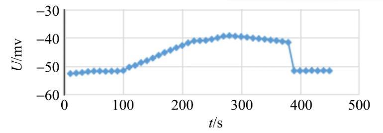 金屬吊環(huán)這一運(yùn)動(dòng)過程中電壓值也趨于平穩(wěn),對(duì)應(yīng)于圖2中380~450 s這一時(shí)間段的變化曲線.