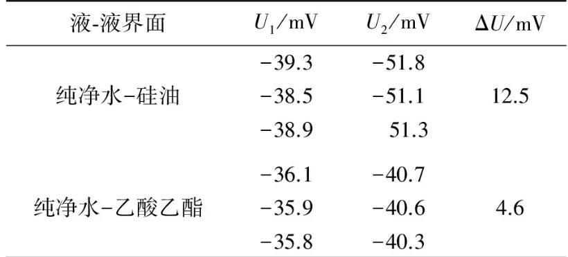 實(shí)驗(yàn)測(cè)量所用金屬吊環(huán)的外徑、內(nèi)徑分別為0.034 96 m和0.033 10 m.在20℃實(shí)驗(yàn)條件下,采用自制2種液體間界面張力的動(dòng)態(tài)實(shí)時(shí)測(cè)量?jī)x,測(cè)量了純凈水-硅油和純凈水-乙酸乙酯間的界面張力.測(cè)量出金屬吊環(huán)由液體I中完全進(jìn)入液體Ⅱ的過程中,液體I的液膜被拉斷前電壓的最大值U1,拉斷后趨于穩(wěn)定時(shí)的電壓值為U2,數(shù)據(jù)結(jié)果如表1所示.