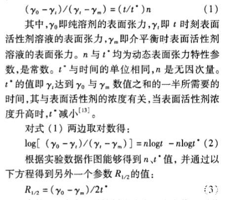 其中,即純?nèi)軇┑谋砻鎻埩?,即t時刻表面活性劑溶液的表面張力,即介平衡時表面活性劑溶液的表面張力。n與t均為動態(tài)表面張力特性參數(shù),是常數(shù)。t與時間的單位相同,n是無因次量。t的值即達到。與7數(shù)值之和的一半所需要的時間,其與表面活性劑的濃度有關(guān),當表面活性劑濃度升高時,t減小。
