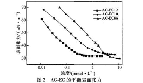以去離子水為溶劑配制不同濃度的AG.EC溶液,靜置12 h后利用krussK12表面張力儀通過wilhelmy吊片法測定其平衡表面張力。控制溶液溫度(254-0.3)clC,測定前去離子水校準表面張力儀至(72±0.3)mN/m。由表面張力()一濃度對數(shù)(1gc)圖,可得AG.EC在水中的臨界膠束濃度(cmc)以及cmc下的表面張力(一)。