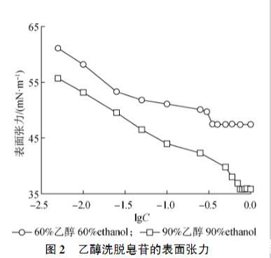 經(jīng)大孔吸附樹(shù)脂純化得到2種皂苷樣品,其表面活性分析表明:60%乙醇和90%乙醇洗脫得到的皂苷的臨界膠束濃度分別為0.35和0.75 g/L,最低表面張力分別為47.43和35.83 mN/m。