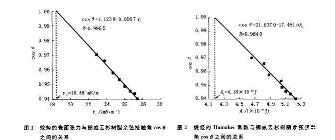 圖1烷烴的表面張力與挪威云杉樹脂余弦接觸角cos0之間的關(guān)系