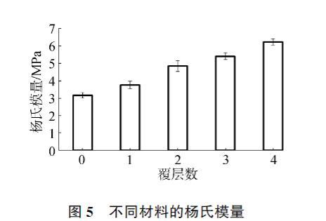 對(duì)羥基磷灰石和覆層材料的楊氏模量進(jìn)行了測(cè)量,結(jié)果如圖5所示。空白的羥基磷灰石材料的楊氏模量為3.14±0.16 MPa,隨著覆層層數(shù)的增加楊氏模量逐漸增加,最高可達(dá)6.21±0.18 MPa,說(shuō)明膠原蛋白肽的覆層能夠有效地改善羥基磷灰石材料的力學(xué)性能,提高其楊氏模量。