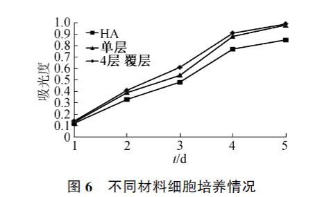 MC3T3-E1細(xì)胞在羥基磷灰石和覆層材料上培養(yǎng)5天的增殖情況見(jiàn)圖6。因結(jié)果類似,圖中僅列出了單層和4層覆層材料的增殖結(jié)果,可以看出在覆層材料上MC3T3-E1細(xì)胞增殖要優(yōu)于空白羥基磷灰石材料,表明所制覆層材料不僅無(wú)細(xì)胞毒性,而且因膠原蛋白肽的優(yōu)良生物相容性,能一定程度上促進(jìn)細(xì)胞增殖。所用的羥基磷灰石和膠原蛋白肽都是經(jīng)過(guò)實(shí)踐證明的生物相容性良好的材料,其對(duì)材料生物性能的提升作用是由其本身的生物相容性良好引起的,因此覆層層數(shù)對(duì)生物性能提升作用不明顯。