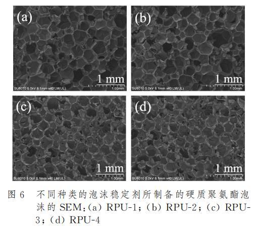 泡沫穩(wěn)定劑的存在對(duì)于硬質(zhì)聚氨酯泡沫性能影響在宏觀上有著十分顯著的體現(xiàn)。圖5是添加不同種類(lèi)的泡沫穩(wěn)定劑后制樣得到的硬質(zhì)聚氨酯泡沫橫截面的數(shù)碼照片。結(jié)果表明,接枝APEG鏈段的PAVE-5和PGVF-6泡沫穩(wěn)定劑所制備的聚氨酯泡沫RPU-3和RPU-4,其泡孔結(jié)構(gòu)相較于市售產(chǎn)品所制備的聚氨酯泡沫展現(xiàn)出了更加細(xì)膩均勻的泡孔結(jié)構(gòu),而市售產(chǎn)品所形成的泡沫則表現(xiàn)出較為粗糙且孔徑不均勻的泡孔結(jié)構(gòu)。這表明親水結(jié)構(gòu)有利于泡沫穩(wěn)定劑均勻分散在多元醇中并使得反應(yīng)充分進(jìn)行,泡孔尺寸細(xì)小致密,有利于改善硬質(zhì)聚氨酯泡沫的壓縮性能。