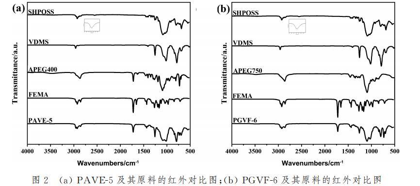 通過(guò)紅外光譜對(duì)所制得功能材料的官能團(tuán)化學(xué)狀態(tài)進(jìn)行表征分析,圖2(a)和2(b)分別為PAVE-5和PGVF-6及其原料的紅外吸收光譜圖。PAVE-5和PGVF-6譜圖中,能夠清晰觀察到處于2960cm-位置的CH3反對(duì)稱(chēng)伸縮吸收峰,處于2930和2860cm-1的CH2伸縮吸收峰,處于1720cm-位置的酯基C=O伸縮吸收峰,處于1256cm-1位置的C-O-C伸縮吸收峰,和處于1090和1010cm-位置的Si-O-Si吸收峰,而原本SH-POSS處的S-H吸收峰消失,VDMS、APEG400、APEG750和2-壬烯酸甲酯的單體C=C伸縮吸收峰也消失,表明PAVE-5和PGVF-6制備成功。