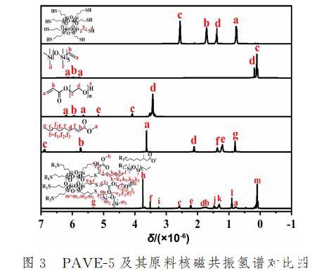 采用核磁共振氫譜對(duì)所制備復(fù)合材料的化學(xué)結(jié)構(gòu)進(jìn)一步表征分析。圖3為PAVE-5以及其原料的核磁共振對(duì)比圖。PAVE-5譜圖中,SH-POSS的-SH質(zhì)子氫吸收峰已經(jīng)消失,接枝成功的APEG400烯烴雙鍵的質(zhì)子氫吸收峰已經(jīng)明顯消失,末端連接的-OH質(zhì)子氫吸收峰在5.32x10-6處;同樣反應(yīng)成功的2-壬烯酸甲酯單體,烯烴雙鍵的質(zhì)子氫吸收峰也同樣消失不見(jiàn),連接O的末端烷烴-CH3質(zhì)子氫吸收峰處于3.75x 10-6的位置;最后成功反應(yīng)的VDMS單體,烯烴雙鍵的質(zhì)子氫吸收峰也已經(jīng)消失,Si上連接的所有甲基CH3分別處在0.09x10-6和0.14x10-6處,可以得知PAVE-5成功合成。