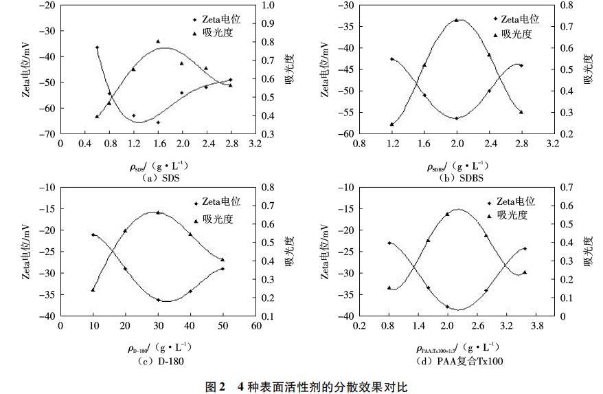 圖2為pH=7的條件下,CNFs(質量濃度0.05g/L)懸浮液的Zeta電位及吸光度隨表面活性劑濃度的變化情況.由于4種表面活性劑中,SDS與SDBS均為陰離子型表面活性劑,D-180、PAA和Tx100雖為高分子聚合物,但在分散過程中均可電離出陰離子,故懸浮液中CNFs表面的Zeta電位均為負值.從Zeta電位曲線來看,4種懸浮液的Zeta電位絕對值均隨表面活性劑濃度的增加而呈現(xiàn)先增大后減小的趨勢,期間出現(xiàn)明顯峰值.從吸光度曲線來看,4種懸浮液的吸光度曲線也隨表面活性劑濃度的增加而先增大后減小,同樣存在明顯的峰值.綜合分析2條曲線可以得出4種表面活性劑的最佳分散濃度:SDS的最佳分散濃度為1.6~g/L,SDBS的最佳分散濃度為2.0~g/L,D-180的最佳分散濃度為30 g/L,PAA復合Tx 100的最佳分散濃度為2.0~g/L.通過橫向對比4幅曲線圖,可以比較4種表面活性劑在各自最佳分散濃度下對CNFs的分散效果.SDS在最佳分散濃度下得到的CNFs懸浮液Zeta電位絕對值達到60 mV,吸光度達到0.80,均高于其他3種表面活性劑,說明SDS的分散性能最好,形成的CNFs懸浮液穩(wěn)定性最高.SDBS的分散效果次之,在最佳分散濃度下,CNFs懸浮液的Zeta電位絕對值為56 mV,吸光度達到0.75.再次是D-180,在其最佳濃度下,懸浮液的Zeta電位絕對值為37 mV,吸光度為0.67.分散效果最差的為PAA復合Tx100,所得的CNFs懸浮液的Zeta電位絕對值為38mV,吸光度僅為0.55.