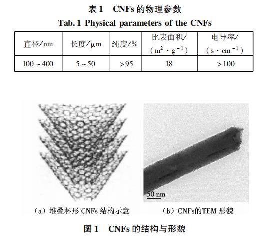 納米碳纖維(carbon nanofibers,CNFs)是近十年興起的一種新型亞微米增強纖維材料,它是化學氣相生長碳纖維的一種形式,一般通過裂解氣相碳氫化合物制備,是構成以碳黑、富勒烯、單壁和多壁碳納米管為一端,以連續(xù)碳纖維為另一端鏈節(jié)中的一環(huán).CNFs的直徑一般在150~400nm之間,與碳納米管(CNTs)相比,CNFs的制備更易于實現(xiàn)工業(yè)化生產(chǎn).CNFs有著優(yōu)異的物理性能、力學性能和化學性能.研究表明,CNFs的抗拉強度可以達到2~5 GPa,平均彈性模量為300 GPa.除具有普通氣相生長碳纖維的特性,如低密度、高比模量、高比強度、高導電性等性能外,CNFs還具有缺陷數(shù)量少、比表面積大、結構致密等優(yōu)點,這使得CNFs在納米復合材料領域得到了廣泛的應用.然而,納米復合材料的性能往往會受到兩個主要因素的影響,一個是納米材料在基體材料中的分散程度,另一個是納米材料表面與基體材料之間的黏結強度和能量.由于受到范德華力的的影響,CNFs彼此吸引并相互纏結在一起,懸浮于水的表面,幾乎無法均勻溶解,這大大制約了CNFs在復合材料中的應用.如何解決CNFs在水性體系中的分散已成為研究者廣泛關注的熱點.