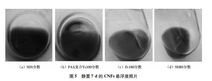 圖5為靜置7d后4種表面活性劑分散的CNFs懸浮液的狀態(tài).可以看出,采用SDS分散的CNFs懸浮液中未見(jiàn)明顯沉淀,SDBS分散的懸浮液中稍有沉淀,PAA復(fù)合Tx100分散的懸浮液和D-180分散的懸浮液中均能觀察到明顯的黑色沉淀物.