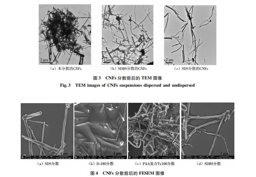 (2)TEM下觀察SDS與SDBS分散的CNFs懸浮液,可以看到CNFs纏結(jié)現(xiàn)象明顯得到改善,可觀察到單根CNF存在,SDS對(duì)CNFs的分散效果強(qiáng)于SDBS.