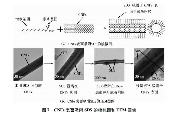 貌,而是在CNFs表面產(chǎn)生一種非共價(jià)鍵修飾,表面活性劑分子通過(guò)疏水端吸附在CNFs的表面,有時(shí)為平躺式吸附,通過(guò)親水端與水相互作用而鉆入水中,來(lái)實(shí)現(xiàn)CNFs在水性體系中的分散.離子型表面活性劑(如SDS和SDBS)主要依靠其親水性基團(tuán)與憎水性基團(tuán)之間的庫(kù)侖吸引力來(lái)實(shí)現(xiàn)吸附的作用,非離子型表面活性劑(如Tx100)主要依靠親水基團(tuán)之間的靜電斥力或特殊的吸附機(jī)理吸附在CNFs的管壁上保持體系穩(wěn)定,阻止CNFs的團(tuán)聚.