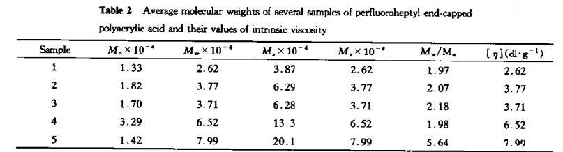 全氟庚雙酰過氧化物的熱分解屬于一級動力學反應,熱分解生成的全氟庚烷基自由基是一個非?;顫姷淖杂苫?,可引發(fā)丙烯酸(AA)在較低溫度下聚合,但產(chǎn)率較低,如表1所示。GPC分子量測定結果(表2)表明,隨丙烯酸與全氟庚基摩爾比增加,產(chǎn)物分子量相應增加,在低摩爾比情況下,多分散指數(shù)約在2左右,而高摩爾比時,分子量分布更寬,其多分散指數(shù)高達5以上。
