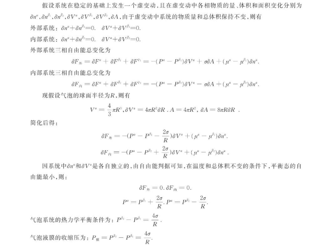 設(shè)氣泡穩(wěn)定時液膜為α相,泡外蒸汽為β相,泡內(nèi)蒸汽為β2相,泡外表面為相,泡內(nèi)表面為2相.若將氣泡表面理想化為標準球面,則表面相的物質(zhì)量n"=n=0.當氣泡穩(wěn)定后系統(tǒng)滿足熱平衡條