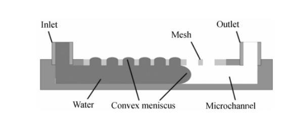 氣溶膠到水溶膠的采樣,一方面要求管道是開放的,以保證空氣中的生物質(zhì)能夠進(jìn)入液體;另一方面為了避免液體在流動過程中外泄,管道必須封閉。本文設(shè)計(jì)了一種開放的管道,其頂部開放面覆蓋有疏水柵網(wǎng),如圖1所示。疏水柵網(wǎng)孔中的水在表面張力的作用下會形成一個彎月面,阻止水從柵網(wǎng)孔中流出。這樣空氣中的生物質(zhì)就能通過柵網(wǎng)孔進(jìn)入管道,同時管道中的液體可以穩(wěn)定流動而不會外溢。