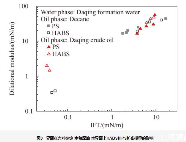 圖8界面張力對(duì)癸烷-水和原油-水界面上HABS和PS擴(kuò)張模量的影響