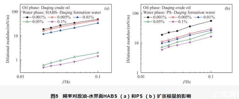 不同含量的HABS和PS在大慶原油-水界面的擴(kuò)張模量隨頻率的變化趨勢(shì)如圖5所示??梢钥闯觯琀ABS和PS在原油-水界面的擴(kuò)張模量隨著頻率增大而線性增加,這與圖3中正癸烷-水界面的變化趨勢(shì)相同,作用機(jī)制也相同。