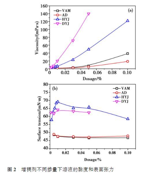 相同摻量下,DYJ的黏度最高,其次是HYJ,VAM和AD黏度在低摻量下接近,摻量達(dá)到0.10%之后,VAM黏度高于AD;VAM和AD的黏度隨著摻量的提高緩慢增大,而HYJ和DYJ溶液的黏度隨摻量的提高迅速提高,尤其是DYJ的增長幅度更為顯著。總體來看,增稠劑分子量越大,相同摻量時溶液的黏度越高。從表面張力的結(jié)果來看,相同摻量下,HYJ溶液的表面張力最高,其次是DYJ,VAM和AD的表面張力顯著低于其他兩種增稠劑,且AD略微高于VAM.