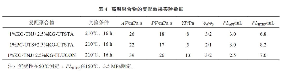 室內(nèi)以濾失改善效果較好的1%DrilFILHT為基礎,考察增黏劑KG-TNJ、PC-UTS與2種抗超高溫改性淀粉的復配效果,選定材料最佳組合。評價配方:基礎配方+1.0%DrilFILHT+復配聚合物,實驗結(jié)果見表4。