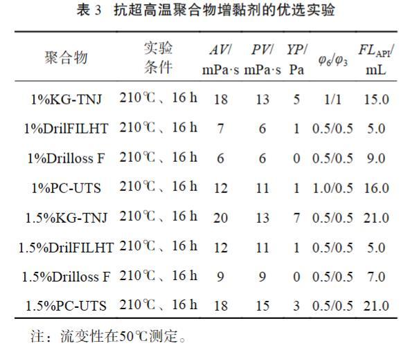 室內(nèi)對4種高溫聚合物增黏劑材料進行了單劑抗溫性能對比評價。其中KG-TNJ為溫敏疏水締和聚合物提黏劑,DrilFILHT為納米片狀氧化鎂酚醛樹脂改性聚合物增黏降濾失劑材料,Drilloss F為納米微球聚合物復合增黏聚合物材料,PC-UTS為某國外代表性高溫聚合物材料。評價配方:基礎配方+2.5%KG-UTSTA+聚合物,實驗結(jié)果見表3。
