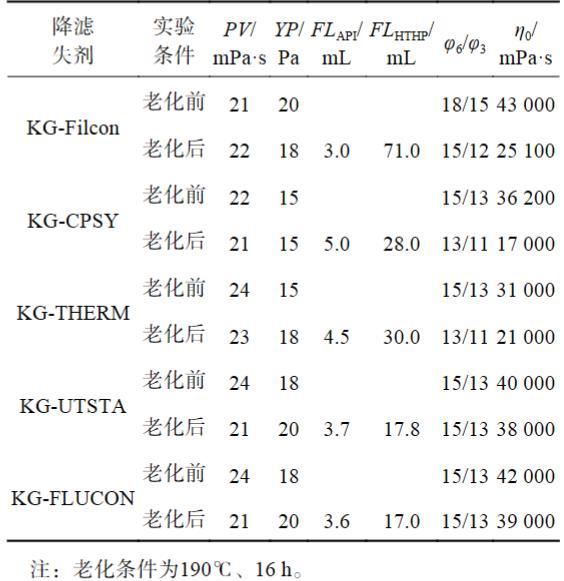 為避免超高溫下材料間的相互影響干擾判斷,室內(nèi)在190℃下先固定KG-TNJ作為增黏劑材料不變,對5種改性淀粉類高溫降濾失劑材料進行了初選。其中,KG-Filcon為海上常用抗高溫改性淀粉;KG-CPSY和KG-THERM均為聚合物接枝改性抗高溫淀粉;KG-UTSTA和KG-FLUCON均為室內(nèi)使用2-丙烯酰胺基-2-甲基丙磺酸AMPS、聚苯乙烯乳液與可溶性淀粉在堿性條件下通過接枝共聚生成抗超高溫改性淀粉,2者區(qū)別在于KG-UTSTA為機械攪拌條件下共聚合成,KG-FLUCON為超聲波機械協(xié)同方式混勻后再進行合成。評價配方:基礎配方+1.0%KG-TNJ+2.5%降濾失劑,實驗結(jié)果見表2。由表2可知,190℃老化后,各體系的流變性能穩(wěn)定,KG-UTSTA和KG-FLUCON體系的高溫高壓降濾失性最好,濾失量小于20 mL,KG-CPSY和KG-THERM體系的高溫高壓降濾失性能次之。分析原因為改性淀粉都引入了抗高溫接枝共聚單體,但是KG-FLUCON、KG-UTSTA除了引入AMPS類抗高溫單體外,還引入聚苯乙烯乳液,增加了接枝改性的抗高溫基團和空間結(jié)構(gòu),通過聚苯乙烯乳液組分的吸附、滲透、覆蓋包裹特性增強了對淀粉結(jié)構(gòu)的高溫保護作用和產(chǎn)物的成膜封堵性能,改善了其抗高溫性和濾失造壁。