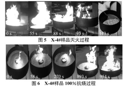 X-4#樣品泡沫具有高泡沫穩(wěn)定性,在以下研究中,著重研究X-4#與X-0#、3%AFFF相比的滅火及抗燒性能,測(cè)得的滅火時(shí)間及100%抗燒時(shí)間見(jiàn)表6。根據(jù)GB 15308—2006規(guī)定,滅火時(shí)間小于180 s,抗燒時(shí)間高于600s的泡沫被認(rèn)為具有成為消防泡沫滅火劑的潛力,X-4#樣品滅火時(shí)間88s、抗燒時(shí)間954 s,抗燒時(shí)間優(yōu)于3%AFFF,滅火時(shí)間比3%AFFF略高,但滿足消防用泡沫滅火劑性能要求,具有良好的消防滅火應(yīng)用潛力。