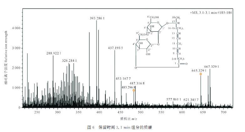保留時(shí)間為3.1 min時(shí)色譜峰豐度最高。對(duì)該物質(zhì)進(jìn)行詳細(xì)分析,質(zhì)荷比(m/z)645.32的碎片為單乙?;〈膬?nèi)酯型槐糖脂的分子離子峰,m/z 667.32為[M+Na]+峰,m/z 483.29為[M+H-C8H12O6]+峰,其中C8H12O6為乙?;〈黔h(huán)。上述分析表明此物質(zhì)為內(nèi)酯型槐糖脂,具體名稱為:17-L-[(2'-O-β-D-吡喃葡萄糖基-β-D-吡喃葡萄糖基)-O-]十八二烯酸-1',4″-內(nèi)酯-6″乙酸酯。