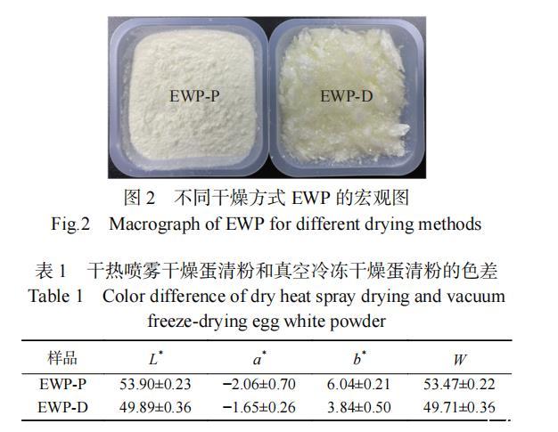 如圖2所示,EWP-P為細(xì)膩的鵝黃色顆粒粉末,EWP-D為松散的黃色片狀物。EWP-P的L*、a*和b*值分別為53.90±0.23、?2.06±0.70和6.04±0.21。EWP-D的L*、a*和b*值分別為49.89±0.36、?1.65±0.26和3.84±0.50(表1)。EWP-P的b*值較大是因?yàn)榈扒宓鞍字械钠咸烟窃趪婌F干燥過程中與蛋白發(fā)生了美拉德反應(yīng)。此外,真空冷凍干燥需將樣品進(jìn)行冷凍預(yù)處理,冷凍過程中,蛋清蛋白會發(fā)生褐變反應(yīng),故EWP-D最終呈現(xiàn)出的顏色較EWP-P黃(圖2)。EWP-P的顏色較EWP-D白(圖2),可能是因?yàn)楦蔁釃婌F干燥的干燥速度快,蛋清中的蛋白質(zhì)受熱時間短。因此在本實(shí)驗(yàn)干燥條件下,干熱噴霧干燥所得的蛋清蛋白粉更亮、更白,易被消費(fèi)者接受。