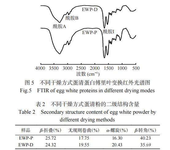 不同干燥方式蛋清蛋白的紅外光譜如圖5所示。EWP-P和EWP-D在酰胺A帶(3700~3200 cm?1)處有強(qiáng)吸收峰,EWP-P的峰強(qiáng)大于EWP-D,表明干燥方式會影響蛋清蛋白的水合能力,這可能與蛋白質(zhì)分子中N-H鍵舒展并與氫鍵形成了締合體,或蛋白質(zhì)分子與葡萄糖以共價鍵結(jié)合有關(guān)。酰胺B帶(2961.64 cm?1)的弱吸收峰主要由C-N鍵產(chǎn)生。酰胺I帶(1600~1700 cm?1)信號主要由C-O鍵伸縮振動引起,與蛋白質(zhì)的二級結(jié)構(gòu)有關(guān),涉及β-折疊(1600~1640 cm?1)、無規(guī)則卷曲(1640~1650 cm?1)、α-螺旋(1650~1660 cm?1)和β-轉(zhuǎn)角(1660~1700 cm?1)。采用Peak fit軟件對不同干燥方式蛋清蛋白的酰胺I帶峰強(qiáng)進(jìn)行高斯曲線擬合分析,根據(jù)峰面積計算其二級結(jié)構(gòu)的相對百分含量,結(jié)果如表2。EWP-P和EWP-D的二級結(jié)構(gòu)以β-折疊和β-轉(zhuǎn)角為主,EWP-P的β-折疊含量增加主要與卵轉(zhuǎn)鐵蛋白熱變性有關(guān),同時分子間的β-折疊結(jié)構(gòu)也易轉(zhuǎn)變?yōu)棣?轉(zhuǎn)角結(jié)構(gòu)。而α-螺旋下降可能是因?yàn)闊嶙冃詫?dǎo)致α-螺旋中的氫鍵斷裂,進(jìn)而發(fā)生了解螺旋現(xiàn)象。EWP-P無規(guī)則卷曲增加,表明其部分有序結(jié)構(gòu)向無規(guī)則卷曲轉(zhuǎn)化,蛋白變性明顯,結(jié)構(gòu)的隨機(jī)性增強(qiáng)。