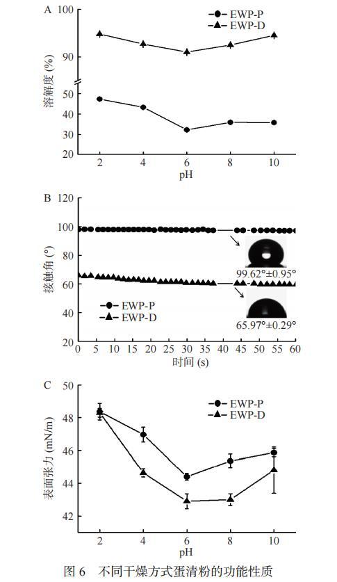 溶解性是蛋白重要的功能特性之一,與接觸角、表面張力、乳化性等密切相關(guān)。如圖6A,不同pH下不同干燥方式的蛋清粉溶解度的測量。EWP-P的溶解度隨著pH的升高先減小后增大,這可能是因?yàn)樵谒嵝院蛪A性環(huán)境中球狀蛋白質(zhì)會發(fā)生部分展開,形成熔融球狀構(gòu)象,變得更加靈活,更容易與水分子作用。pH為6.0時蛋清蛋白的溶解度最低,可能是因?yàn)樵損H與蛋清蛋白中大部分蛋白的等電點(diǎn)相近,蛋白帶電荷量較少,因此容易發(fā)生沉淀。與EWP-P相比,EWP-D在pH6.0時溶解度的下降程度較小,這可能與真空冷凍干燥后蛋清蛋白的微觀結(jié)構(gòu)呈片狀,具有較大的比表面積有關(guān),也可能是因?yàn)槔鋬龈稍锏鞍踪|(zhì)在脫水過程中蛋白質(zhì)變性低,促進(jìn)了可溶性聚集物生成。EWP-D的溶解度遠(yuǎn)大于EWP-P,這是因?yàn)閲婌F干燥是直接將蛋清液霧化后再干燥,其蛋清粉表面會形成一個光滑、抗?jié)裥缘谋∧?,最終導(dǎo)致蛋白的溶解性降低,復(fù)水性差且易結(jié)塊。而真空冷凍干燥經(jīng)過冷凍升華,可保持食品原有的形狀故具有很好的速溶性和復(fù)水性。Shaviklo等也發(fā)現(xiàn)噴霧干燥的含添加劑(花粉)蛋白的蛋白質(zhì)溶解度明顯低于凍干蛋白。