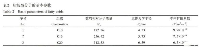 對(duì)比不同鏈長(zhǎng)脂肪酸在不同質(zhì)量濃度時(shí)的動(dòng)態(tài)界面張力(圖9A-9C),發(fā)現(xiàn)雖然脂肪酸在正辛烷中的擴(kuò)散系數(shù)隨著碳鏈的增長(zhǎng)而減?。ū?),但添加高質(zhì)量濃度C20酸時(shí),界面張力值到達(dá)平衡的時(shí)間明顯縮短,這表明脂肪酸烷基鏈長(zhǎng)度會(huì)影響脂肪酸在界面的性質(zhì)。并且發(fā)現(xiàn)脂肪酸烷基鏈越長(zhǎng),與NH2-PEG-GO協(xié)同穩(wěn)定的水-正辛烷界面張力越低。并且隨著脂肪酸質(zhì)量濃度增加,烷基鏈鏈長(zhǎng)增加對(duì)界面張力降低效果越明顯(圖9D)。