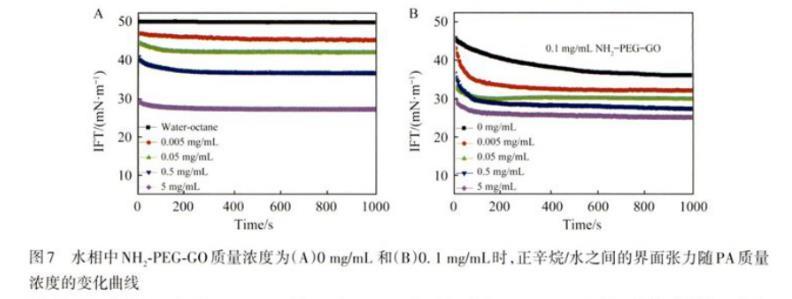 固定NH2-PEG-GO質(zhì)量濃度(0.1 mg/mL),分析改變正辛烷溶液中PA質(zhì)量濃度時(shí)界面張力的變化情況。動(dòng)態(tài)界面張力的演變?nèi)鐖D7所示,當(dāng)正辛烷中PA質(zhì)量濃度小于5 mg/mL時(shí),即使加入微量的NH2-PEG-GO(0.1 mg/mL)就能夠顯著降低界面張力,相比于不添加NH2-PEG-GO時(shí)的情況降低了約15 mN/m。然而,隨著PA質(zhì)量濃度的增加(0.005~5 mg/mL),界面張力僅從32 mN/m降低到25 mN/m(圖7B)。在不添加NH2-PEG-GO時(shí),隨PA質(zhì)量濃度增加(0.005~5 mg/L),界面張力的下降值則約為20 mN/m(圖7A)。這表明NH2-PEG-GO的添加使得PA在界面上吸附減少,NH2-PEG-GO成為降低界面張力的主導(dǎo)因素。然而隨著PA質(zhì)量濃度升高,PA的界面吸附量逐漸達(dá)到飽和,少量NH2-PEG-GO的存在不會(huì)顯著降低界面張力。當(dāng)PA的質(zhì)量濃度達(dá)到5 mg/mL時(shí),存在0.1 mg/mL NH2-PEG-GO僅比不存在時(shí)降低了約2 mN/m,這是由于此時(shí)界面被PA占滿,沒(méi)有足夠的空間供NH2-PEG-GO進(jìn)行吸附。