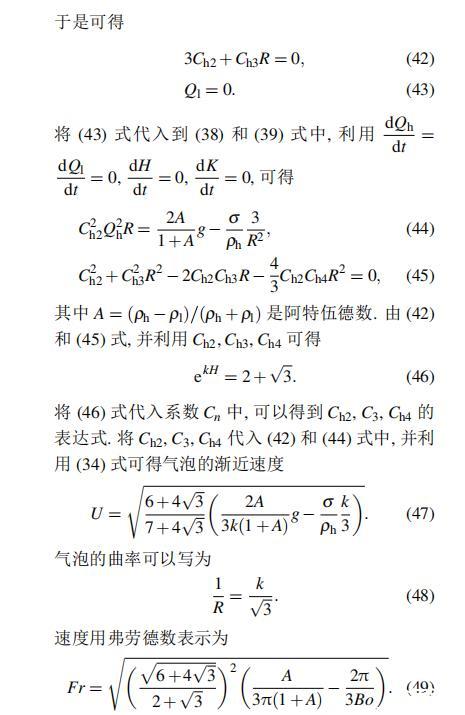 Layzer模型和Zufiria模型都是建立在理想流體之上。然而對實際流體而言,很多因素都可以影響RT不穩(wěn)定性的演化情況,如密度比、黏性、界面張力、壓縮性、外場加速度、Kelvin-Helmholtz不穩(wěn)定性等。Young和Sohn利用Goncharov提出的復(fù)雜速度勢,將Layzer模型推廣并應(yīng)用到非理想流體中,研究了界面張力對RT不穩(wěn)定性增長的影響,發(fā)現(xiàn)界面張力降低了氣泡的增長速率。2011年本文的作者之一利用Zufiria模型研究了黏性對RT不穩(wěn)定性增長的影響。但是,目前沒有人利用Sohn提出的簡單速度勢的Layzer模型研究界面張力對RT不穩(wěn)定性的影響,也沒有人利用Zufiria模型研究界面張力對RT不穩(wěn)定性的影響。