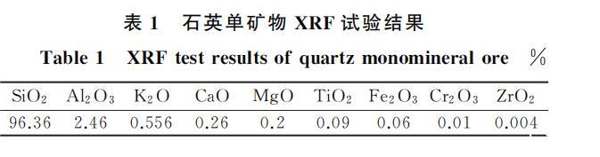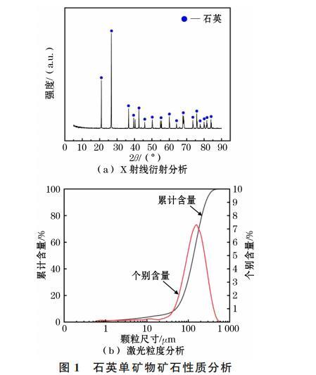 本試驗(yàn)所用的單礦物石英取自某礦廠,將制備后的石英單礦物樣品進(jìn)行X射線衍射(XRD)分析、X射線熒光光譜(XRF)分析和激光粒度分析,XRD的分析結(jié)果如圖1(a)所示,XRF的分析結(jié)果見表1,粒度分析如圖1(b)所示。從圖1(a)可以看出,石英單礦物SiO?峰強(qiáng)度以及密度最高,說明SiO?占主導(dǎo)地位。從圖1(b)可以看出,樣品的中值粒徑D??達(dá)到了133.5μm,D??則達(dá)到了264.3μm.綜合上述礦物的純度以及粒度,石英可滿足后續(xù)單礦物試驗(yàn)以及機(jī)理分析的要求。