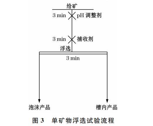 采用一次粗選的試驗(yàn)流程,探究十二胺(DDA)和YTDB在不同礦漿pH、不同捕收劑用量下,對石英以及赤鐵礦回收率的影響。單礦物浮選試驗(yàn)在XFD-Ⅲ浮選機(jī)進(jìn)行,在室溫條件下配制礦漿,稱取2.00 g的單礦物放入浮選槽中,再加入20 g去離子水,控制浮選機(jī)的攪拌速度為1900 r/min,攪拌2 min以充分?jǐn)噭虻V漿。加入事先準(zhǔn)備好的pH調(diào)整劑調(diào)漿3 min,再加入捕收劑調(diào)漿3 min后,開始刮泡,控制刮泡時間為3 min.浮選結(jié)束后,將精礦進(jìn)行過濾、烘干、稱重,隨后計(jì)算其回收率。單礦物浮選試驗(yàn)流程如圖3所示。